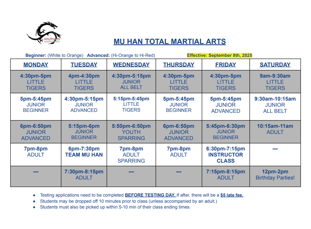 Find the perfect time for your training. Our structured weekly timetable is designed for students of all ages and levels.